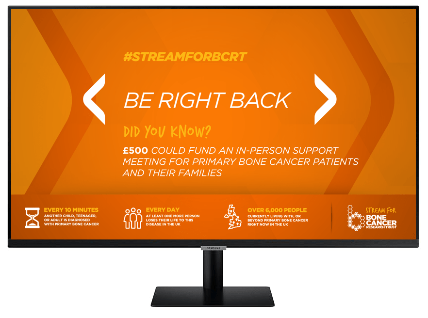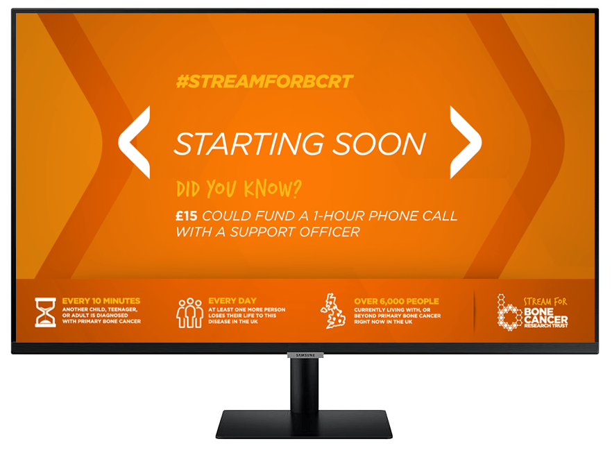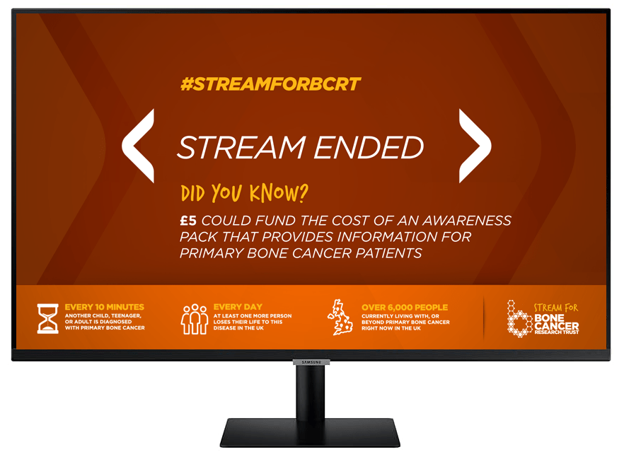 To engage the online gaming community, a series of screens was designed for streamers when sharing content. These screens highlighted information to illustrate the costs involved in running a charity such as Bonce Cancer Research Trust. I created static desktop graphics as well as animated screen savers which were used within the Twitch gaming interface. As part of the free streaming pack, a watch face was designed to be used on smart watches.