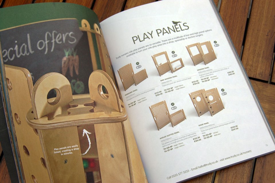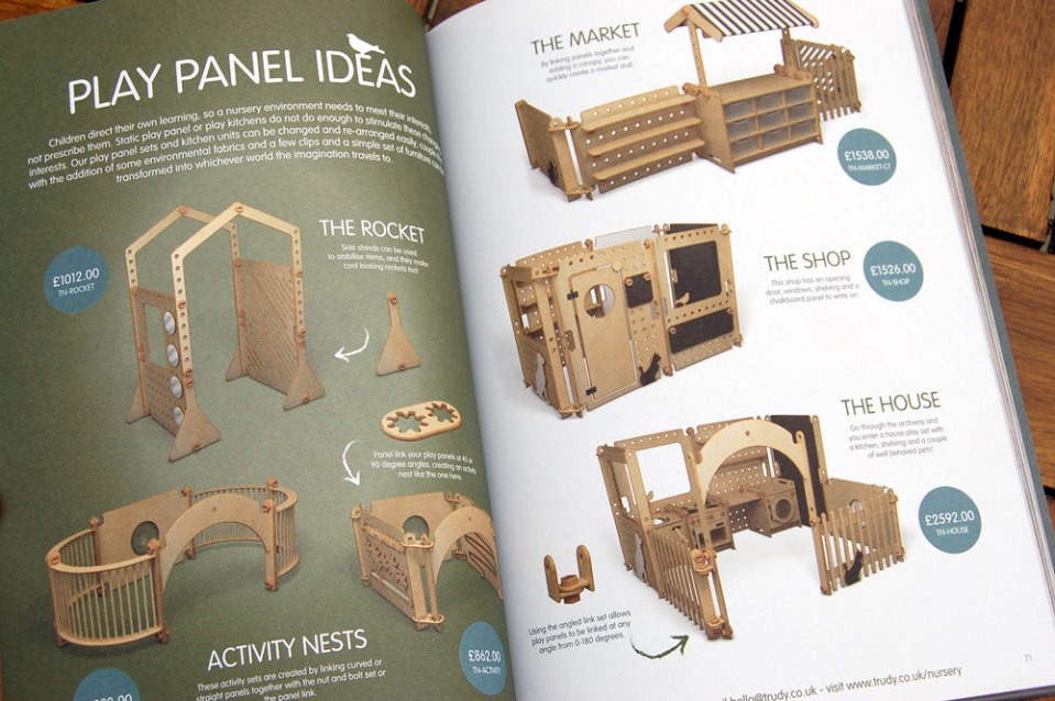 Trudy nursery furniture is a product range manufactured by Claughtons. It was launched to complement the other furniture products aimed at the education market. Made from sustainably managed wood and manufactured in a natural colour, the product launch had to communicate the imaginative uses the furniture could be configured into using the wooden nut and bolt fixings.